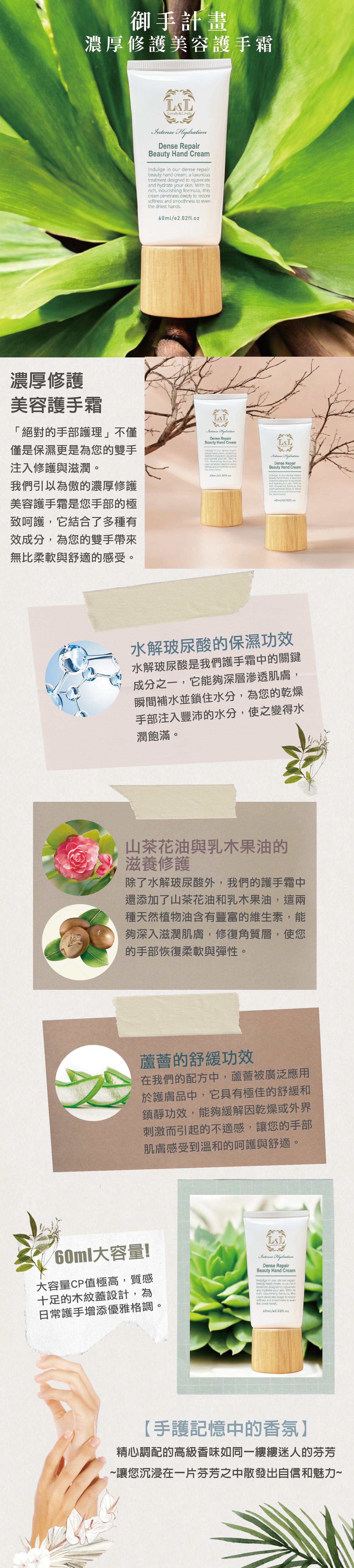 濃郁的配方含有專櫃保養品水解玻尿酸、蘆薈、乳油木果和日本山茶花油成分,能夠深層滋潤肌膚,修護乾裂的手部肌膚,讓您的雙手回復柔軟光滑。無論是在寒冷的冬季還是乾燥的夏季,我們的護手霜都能為您的雙手提供持久的保濕和滋潤效果,讓您的雙手始終保持水嫩細緻。