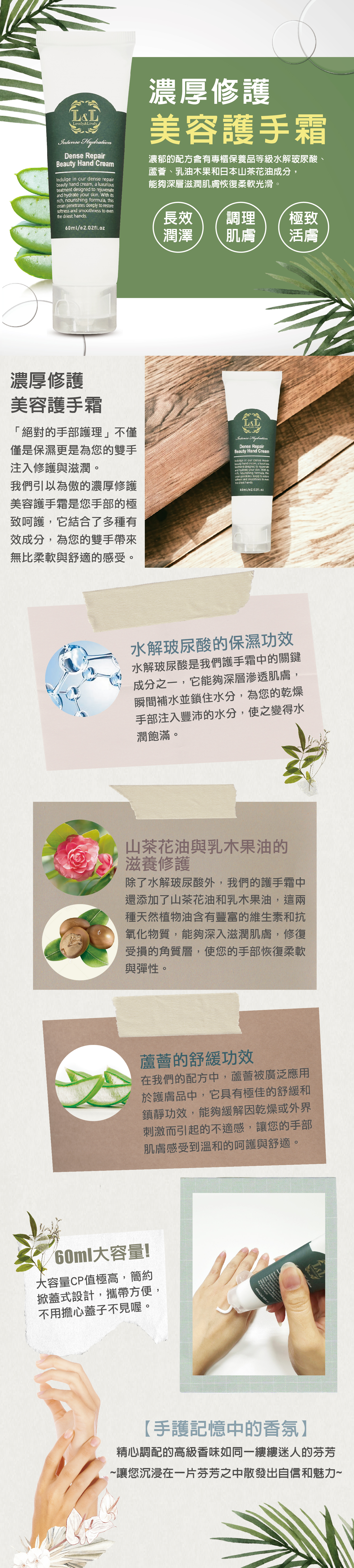 濃郁的配方含有專櫃保養品水解玻尿酸、蘆薈、乳油木果和日本山茶花油成分,能夠深層滋潤肌膚,修護乾裂和受損的手部肌膚,讓您的雙手回復柔軟光滑。無論是在寒冷的冬季還是乾燥的夏季,我們的護手霜都能為您的雙手提供持久的保濕和滋潤效果,讓您的雙手始終保持水嫩細緻。