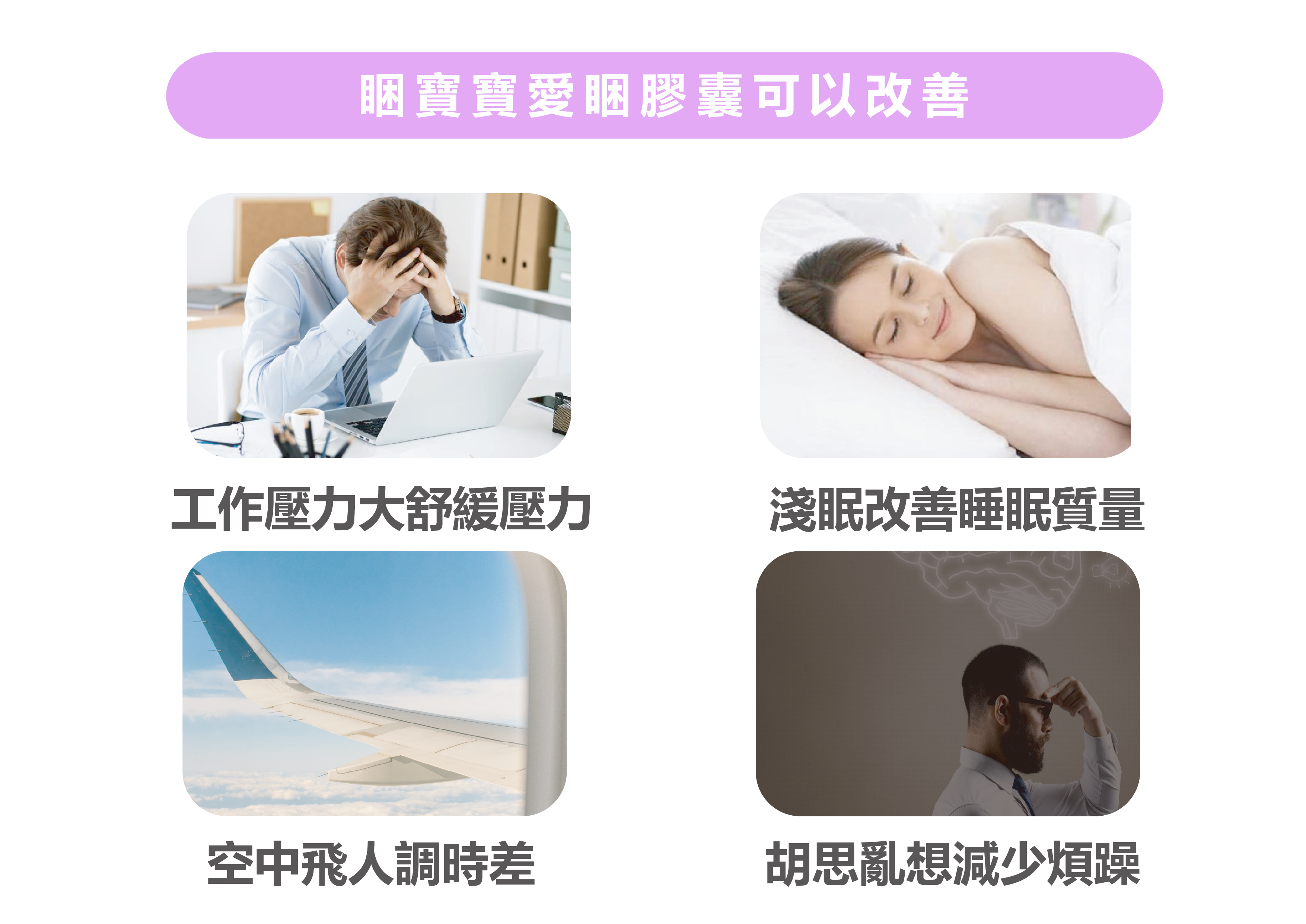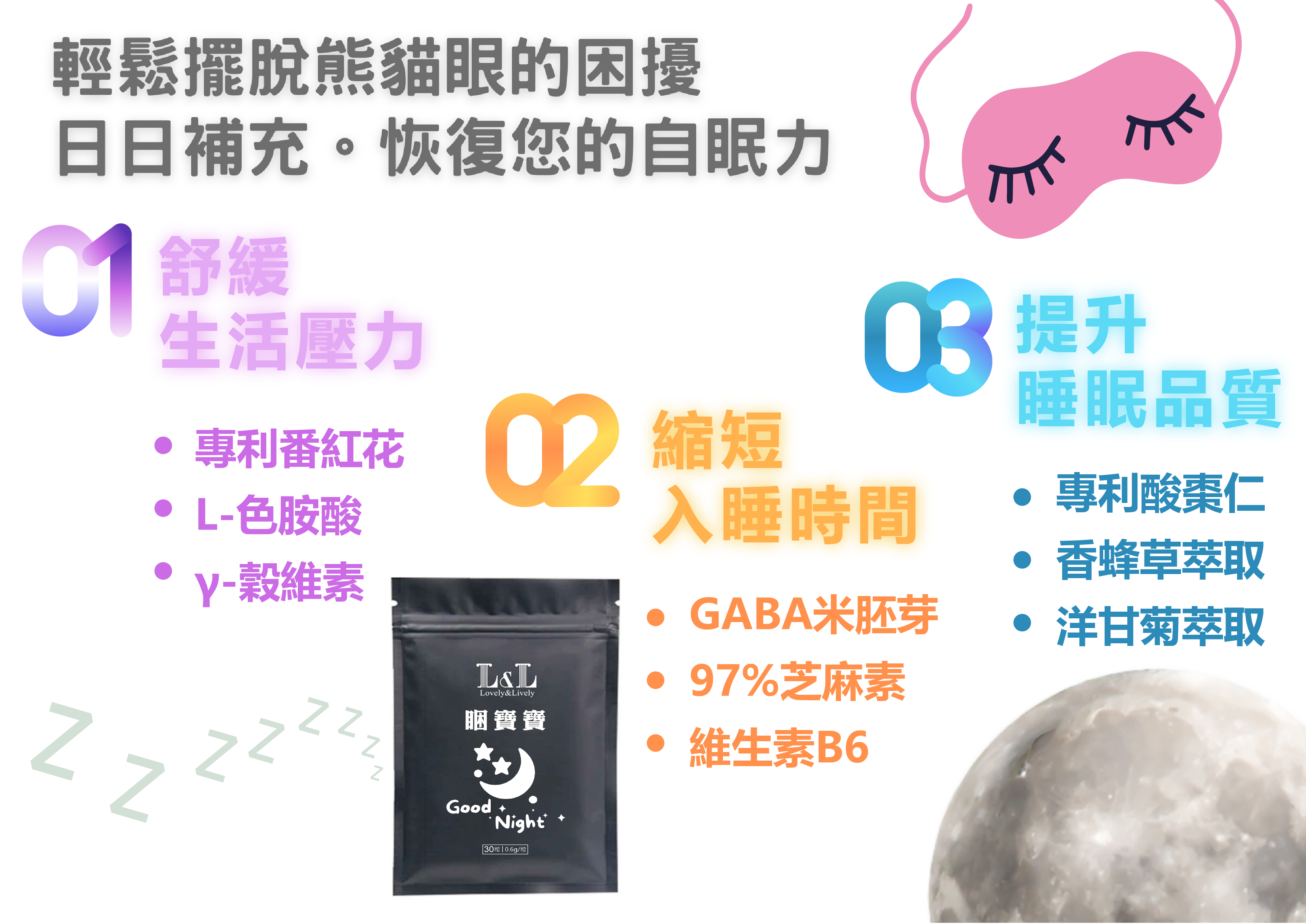 萃取粉(酸棗仁萃取物、麥芽糊精)、香蜂草萃取物(香蜂草萃取物、麥芽糊精)、L-色胺酸、洋甘菊萃取物(洋甘菊萃取物、麥芽糊精)、